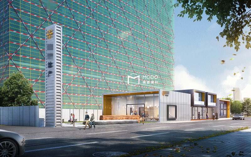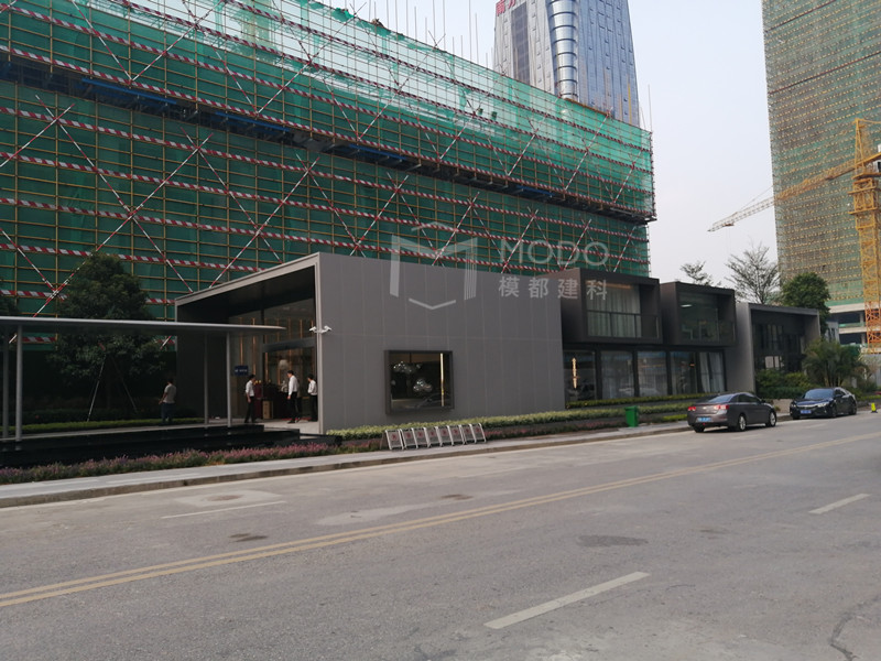 臨時售樓部采用定制集裝箱的模式建造,由預制化的集裝箱作為支持構建,配以裝配式的外立面和內(nèi)裝。建筑分為精神堡壘(樓梯間)接待區(qū)、沙盤展示區(qū)、水吧區(qū)、衛(wèi)生間、洽談區(qū)、辦公室、倉庫等主要功能區(qū),各區(qū)域具有既相互融合又互相獨立,可分可合。根據(jù)功能需要,建筑各部分高度不同。